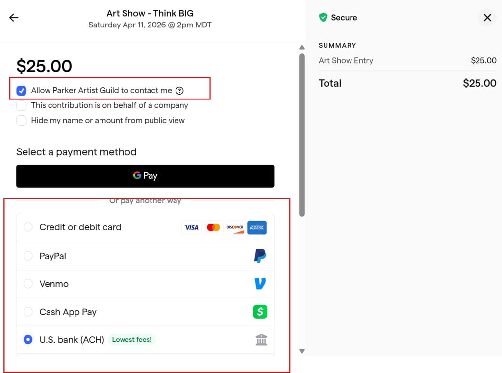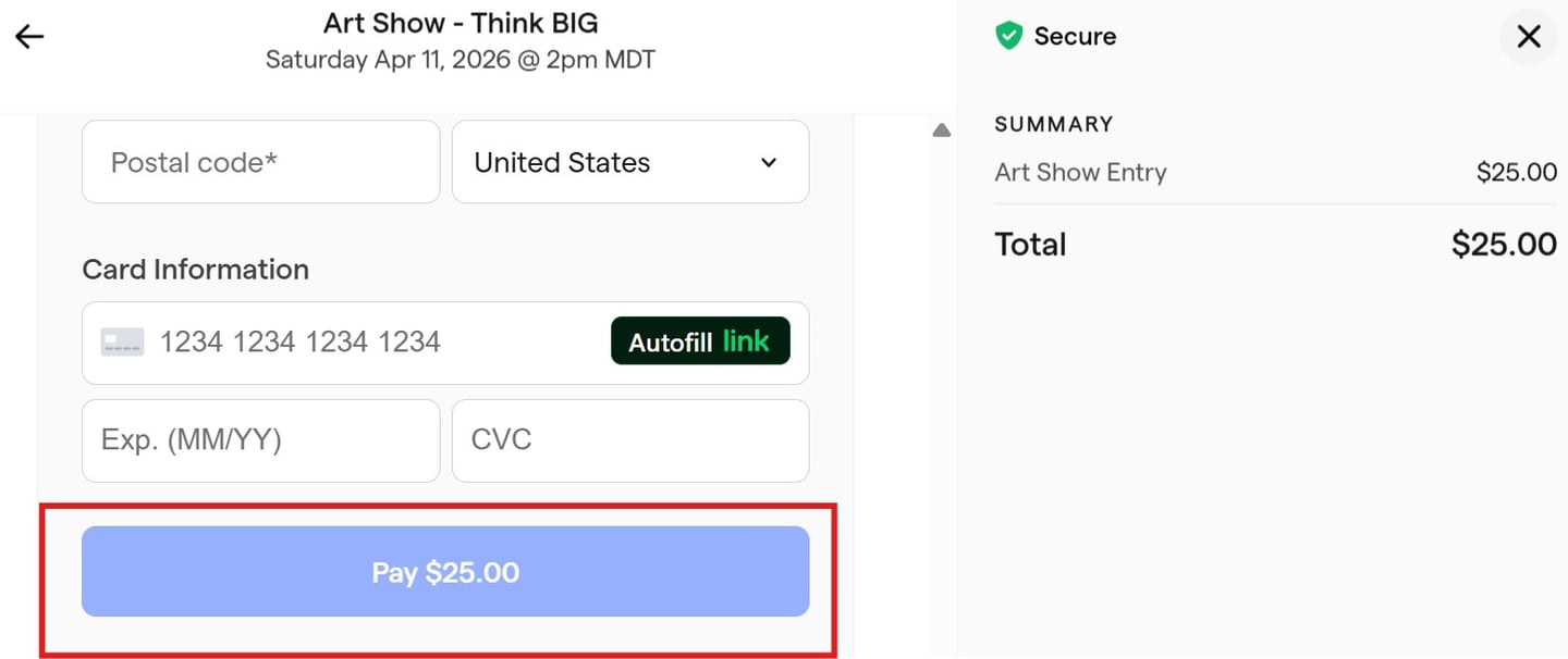 Click your payment method, enter your payment details and then click "Pay $25" to complete your payment.